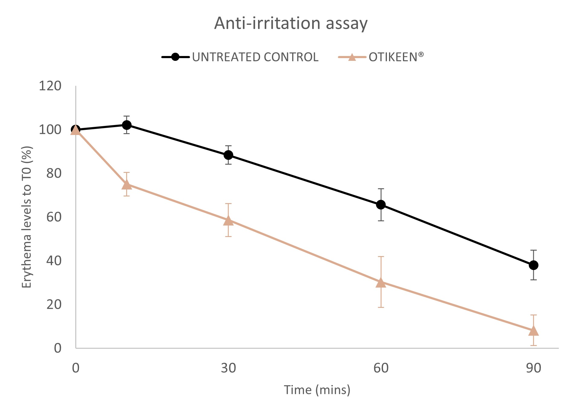 In an anti-irritation clinical study, OTIKEEN® significantly decreased the erythema levels of the epidermis induced by capsaicin, after a single application, by -27pp (10min), -30pp (30min), -35pp (60min) and -30pp (90min), compared to the control (p<0.01, p<0.001, p<0.0001 and p<0.001, respectively).
